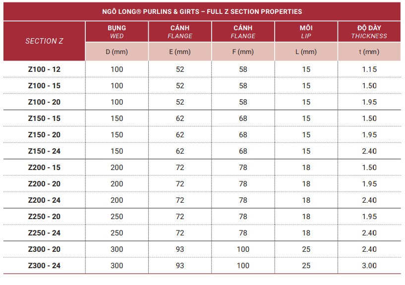 Các thuộc tính của phần sau đây có thể thay đổi do dung sai thương mại về kích thước (tuy nhiên, lưu ý rằng tổng vật liệu được sử dụng sẽ không thay đổi).Mọi thiết kế được thực hiện bằng cách sử dụng các thuộc tính này phải được tính toán bằng AS/NZS4600.