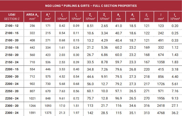 Các thuộc tính của phần sau đây có thể thay đổi do dung sai thương mại về kích thước (tuy nhiên, lưu ý rằng tổng vật liệu được sử dụng sẽ không thay đổi).Mọi thiết kế được thực hiện bằng cách sử dụng các thuộc tính này phải được tính toán bằng AS/NZS4600.